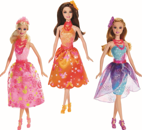 Hlavní tři představitelky z nového filmu Barbie a kouzelná dvířka – Alexa, Romy a Nori jdouna kouzelnou čajovou party. Jsou oděné do blištivých šatů a jsou perfektně upravené od hlavy až k patě. Úchvatné náhrdelníky a vlasovédoplňky ještě více podtrhují jejich neonový lesk.