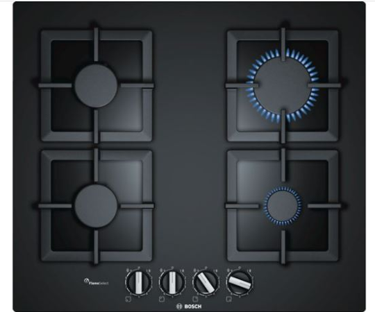 Plynová varná deska na tvrzeném skle s funkcí FlameSelect: zaručí perfektní výsledky vaření díky preciznímu nastavení stupně výkonu plynového hořáku v rozsahu 1 až 9 stupňů.