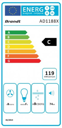 *Dekorativní odsavač par Brandt AD 1188X Šíře 90 cm Elektronické ovládání s tlačítky 1 motor-3 rychlosti Maximální výkon 740 m3/h Hlučnost: 56 dB(A) Nezávislé ovládání: 2 halogenová světla 2