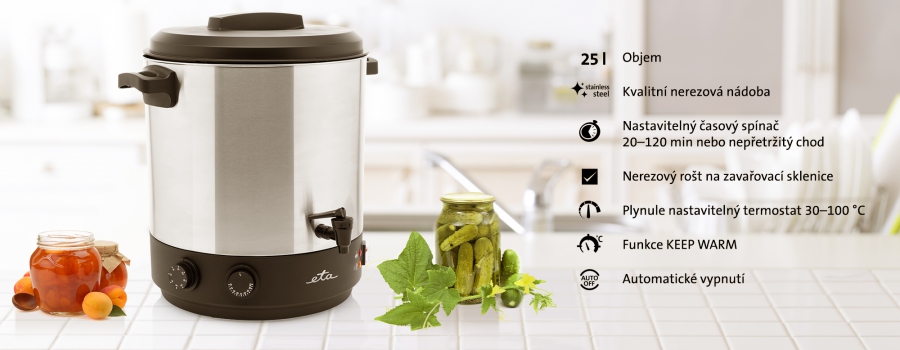 Zavařovací hrnec ETA Granny je vybaven kvalitní nerezovou nádobou o objemu 25 litrů, která pojme až 14 litrových zavařovacích sklenic. Celý proces zavařování vám usnadní odnímatelná nerezová mřížka, plynule nastavitelný termostat (30–100 °C) a nastavitelný časový spínač (na 20–120 minut).