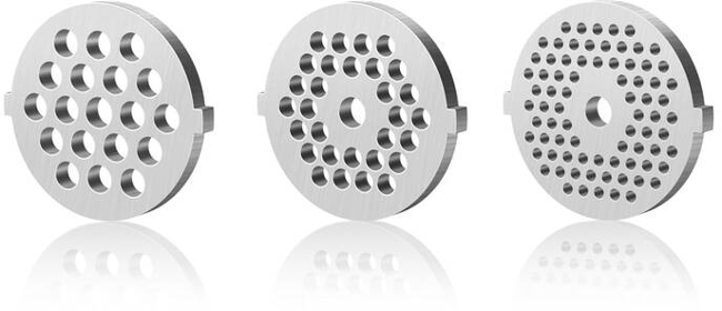- Mlýnek na maso o průměru 54 mm (3 velikosti mlecích destiček pro střední, hrubé a velmi hrubé mletí, nástavec na výrobu uzenin, násypka, pěchovadlo, uvolňovací klíč)
