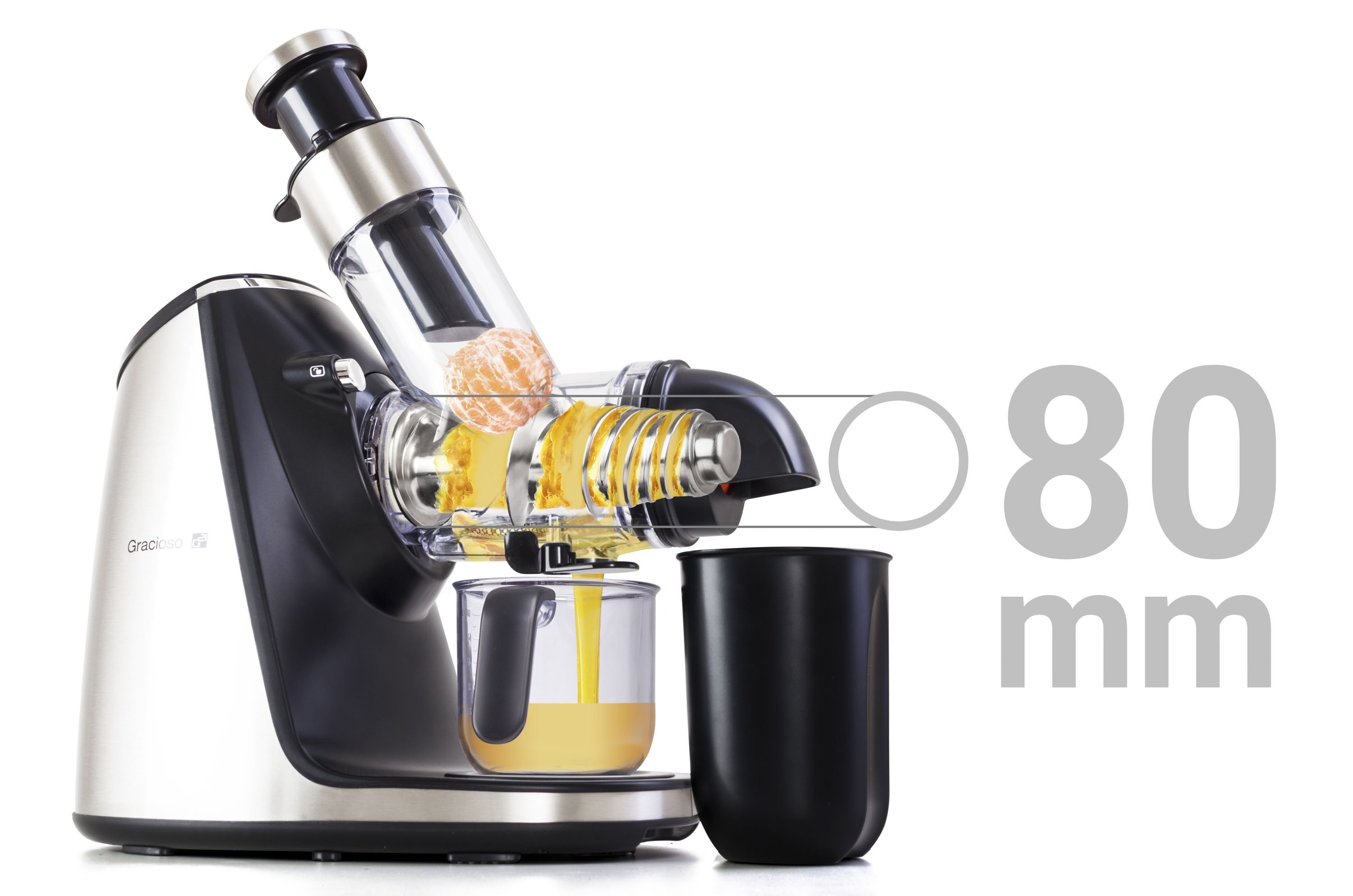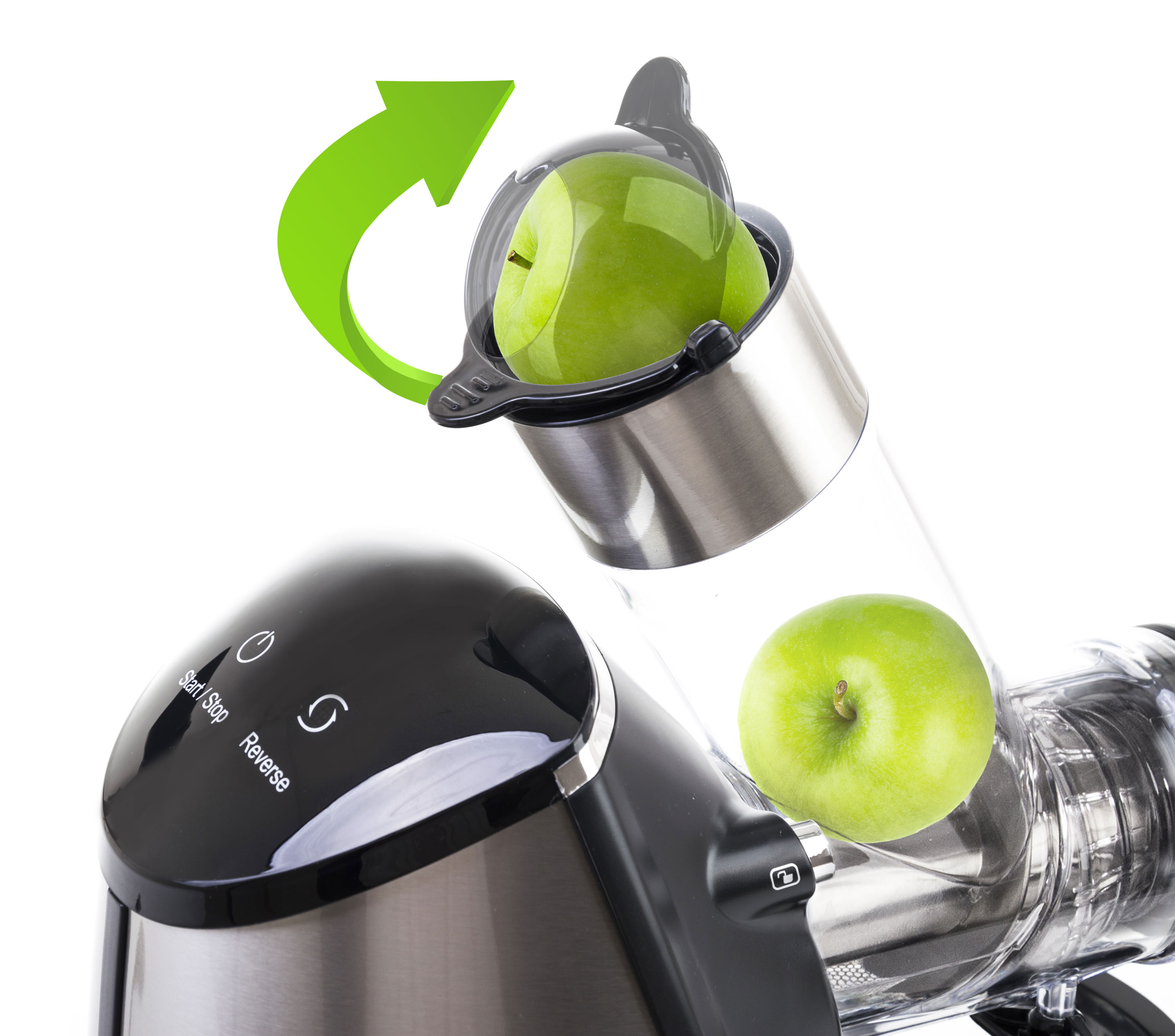 Plnící otvor je uzpůsobený pro vkládání velkých kusů ovoce a zeleniny, jako jsou mandarinky nebo jablíčka i pro odšťavňování podlouhlých surovin, například mrkve nebo řapíkatého celeru.