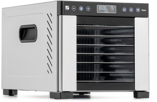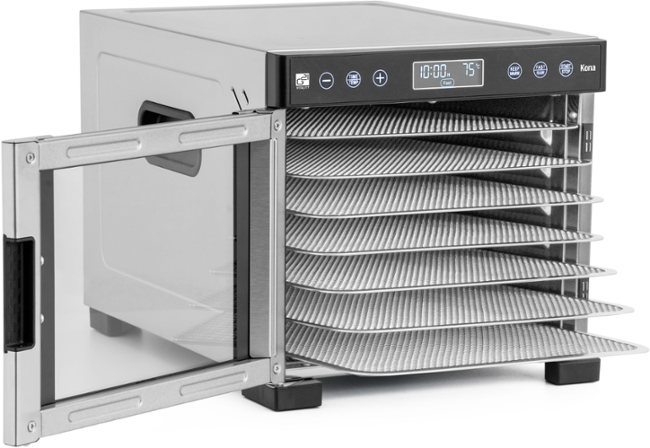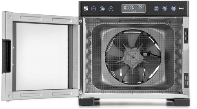 Zatímco u jiných sušiček v této cenové kategorii je ventilátor umístěný na spodní části, takže plata se sušenými surovinami musíte pro lepší usušení přesouvat, Kona je svým provedením o třídu výš. Díky strategicky umístěnému ventilátoru v ní proudí vzduch horizontálně. Dvířka s okénkem na čelní straně navíc zajišťují nižší spotřebu energie, dokonalou cirkulaci vzduchu, efektivnější sušení a zkracují dobu sušení potravin.
