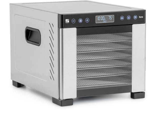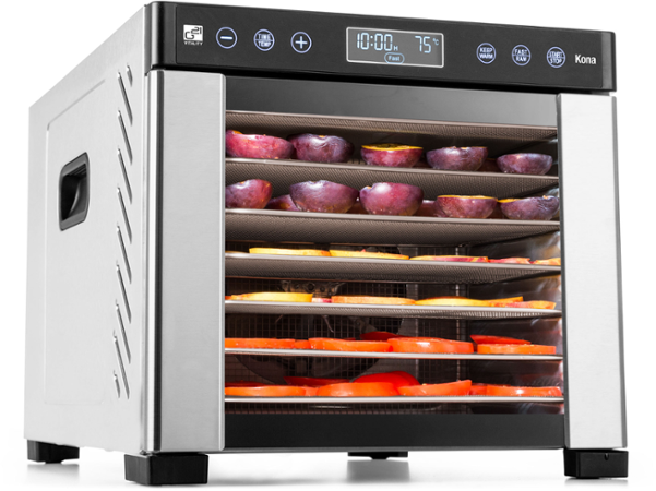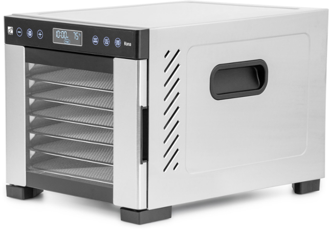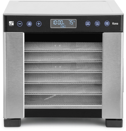 Sucho už má v názvu a svými schopnostmi i výkonem vás tato kompaktní sušička rozhodně překvapí. Pokud jste si při výběru sušičky potravin došli k názoru, že hledáte spíš menší sušičku, zato ale s profesionálními vlastnostmi i provedením, Kona je přesně tou pravou sušičkou ovoce, zeleniny, hub, masa i bylinek pro vás.