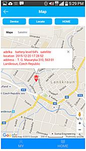 Map – po kliknutí na toto tlačítko se otevře mapa s vyznačením polohy hodinek. Při dobrém GPS signálu bývá přesnost lokace do 5 m. A v mapě je pak GPS pozice označena nápisem satelite. Při nedostatečném GPS signálu (např. uvnitř budov se silnými zdmi) jsou hodinky lokalizovány pomocí sítě GSM, ve které ukáží nejbližší polohu vysílače/dokrývače mobilního operátora. Bod je pak označen nápisem LBS a přesnost této lokace závisí na Vaší vzdálenosti od tohoto bodu.