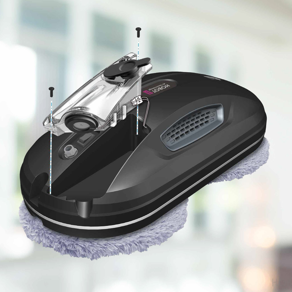V případě, že je třeba vyměnit zanesenou ultrazvukovou trysku, jednoduše vyměníte celý modul zásobníku na vodu uvolněním dvou šroubků a přístroj bude opět fungovat jako nový. Velikost obsahu zásobníku je 24 ml, což vystačí na čištění plochy o rozměru 24 m2. Jako náplň používejte pouze destilovanou vodu nebo originální čistící přípravek značky HOBOT.