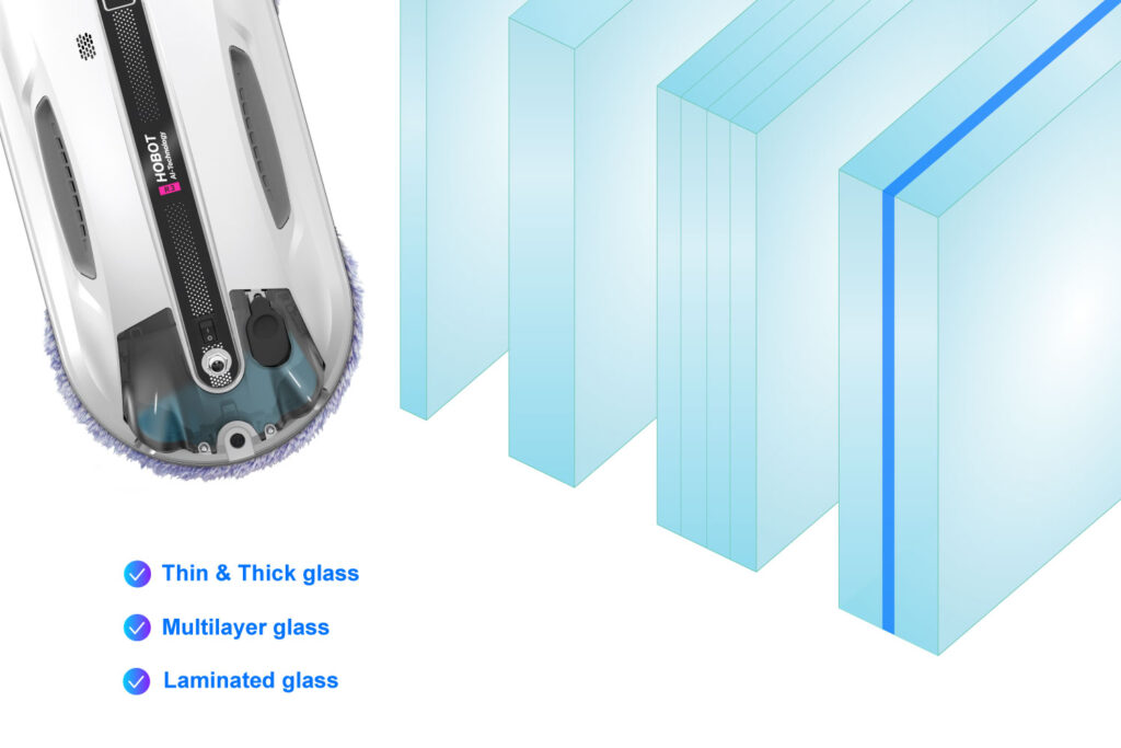 HOBOT R3 je speciálně navržen, aby mohl pracovat na různých tloušťkách a designu skel. Tenké a silné sklo, vícevrstvé sklo, vrstvené sklo.