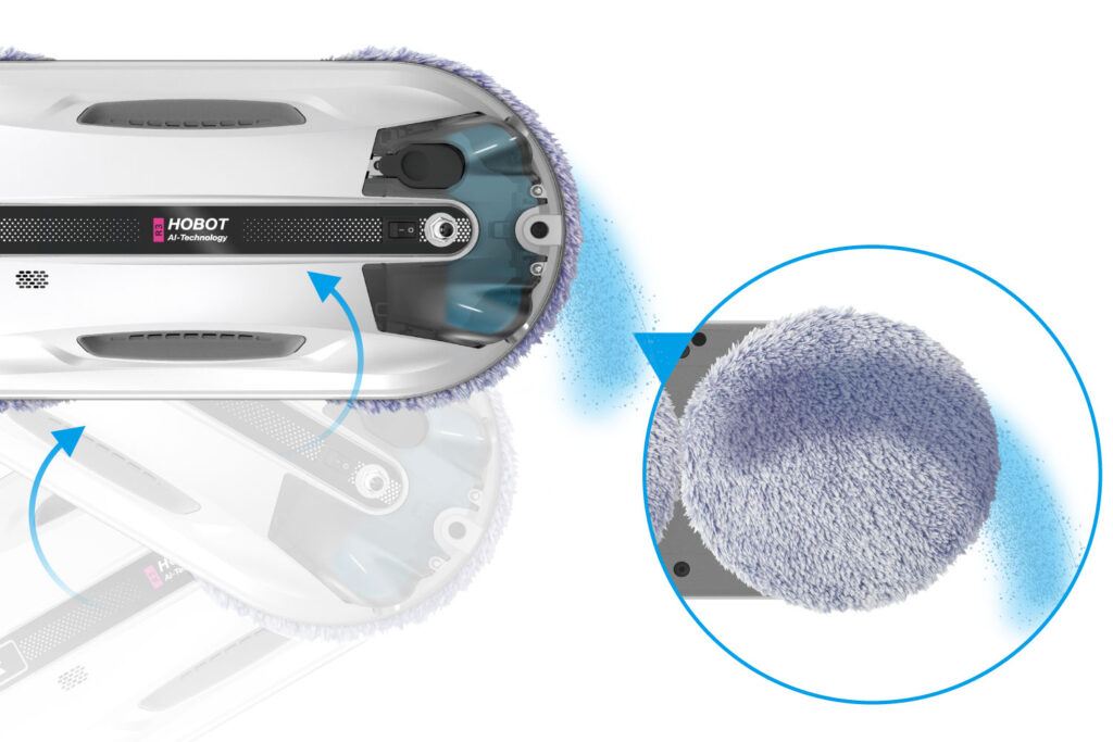 Rotačním pohybem utěrek robotický čistič oken HOBOT R3 napodobuje pohyb ruky jako při manuálním čištění skla. Unikátní systém dvou utěrek z mikrovlákna skleněný povrch perfektně čistí a zároveň leští.
