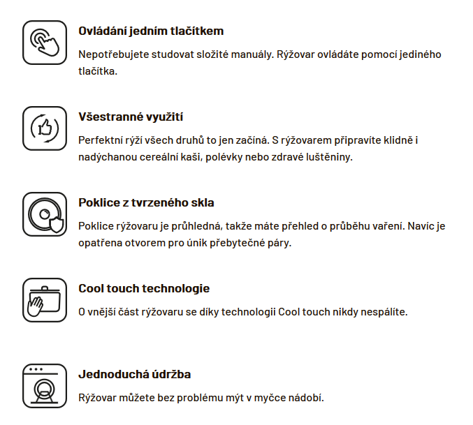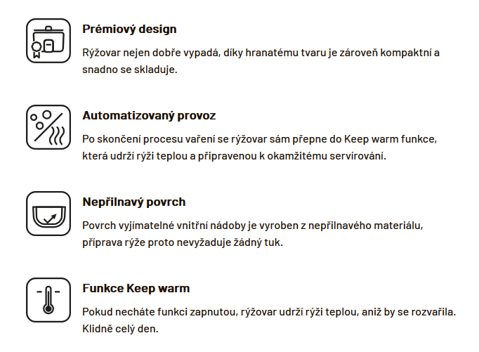 Rýžovar tvoří nádoba o objemu 1 litr s nepřilnavým povrchem. Příprava pokrmů tak nevyžaduje žádný přidaný tuk, a přesto se rýže ani ostatní suroviny nikdy nepřichytí. Velkou výhodou je funkce Keep warm, která udrží rýži teplou klidně celý den. Rýžovar se do tohoto módu přepne automaticky, jakmile skončí proces vaření.