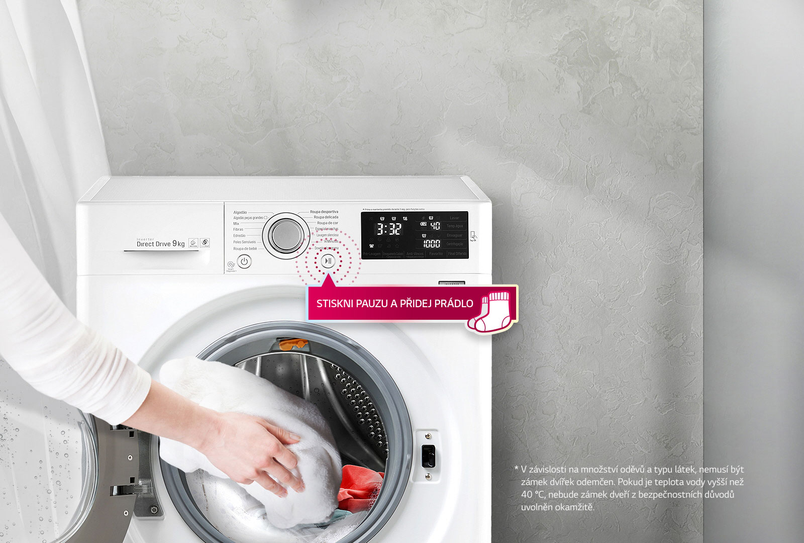 Pokud chcete během praní ještě přidat nějaké prádlo, jednoduše zmačkněte tlačítko "Start/Pauza" a přidejte cokoliv od ponožek až po velkou bundu. U programů Bavlna, Smíšené prádlo, Syntetika a Rychlý 14 se dvířka i během praní ihned otevřou (do cca 3 vteřin).*