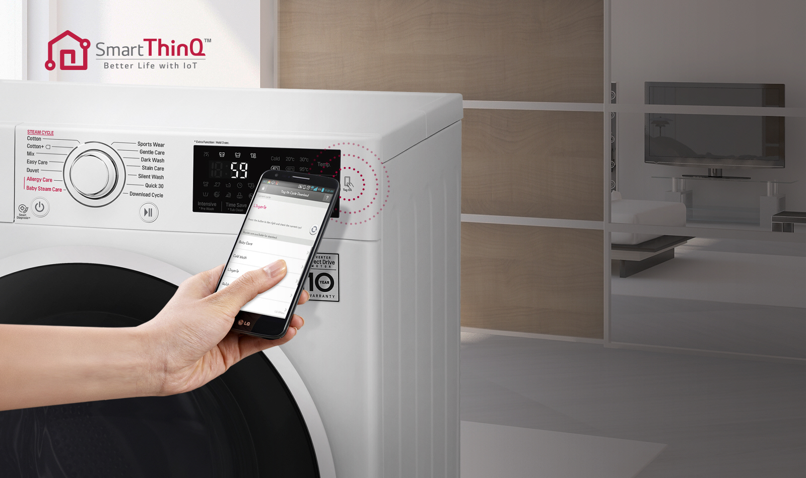 - NFC Tag On (ovládání, stažení programu, statistiky praní a Smart Diagnosis™ přes mobilní aplikaci)