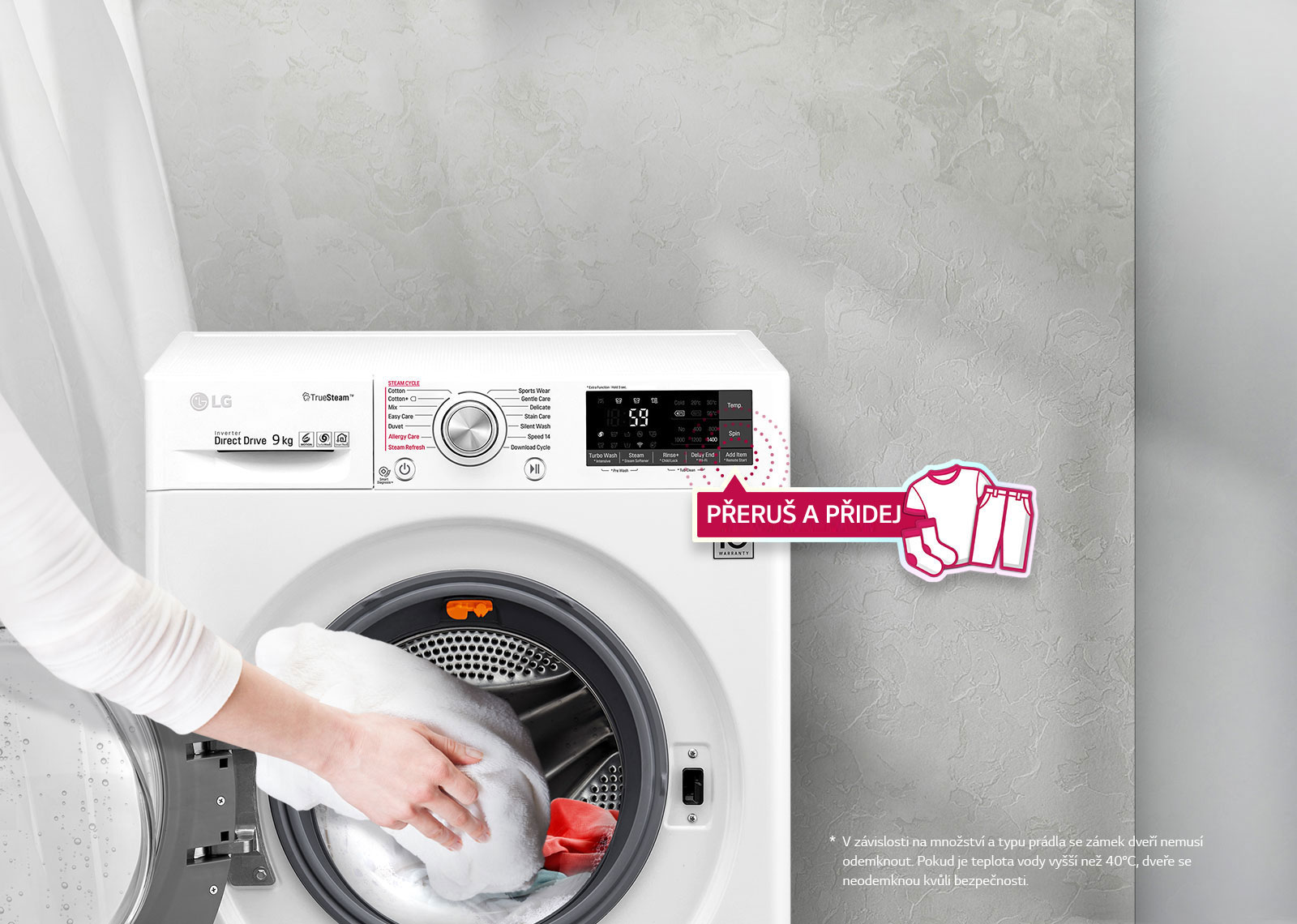 Pokud chcete během praní ještě přidat nějaké prádlo, jednoduše zmačkněte tlačítko "Přidat prádlo" a přidejte cokoliv od ponožek až po velkou bundu. U programů Bavlna, Smíšené prádlo, Syntetika a Rychlý 14 se dvířka i během praní ihned otevřou.