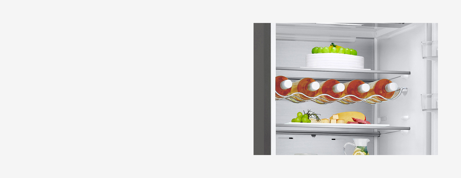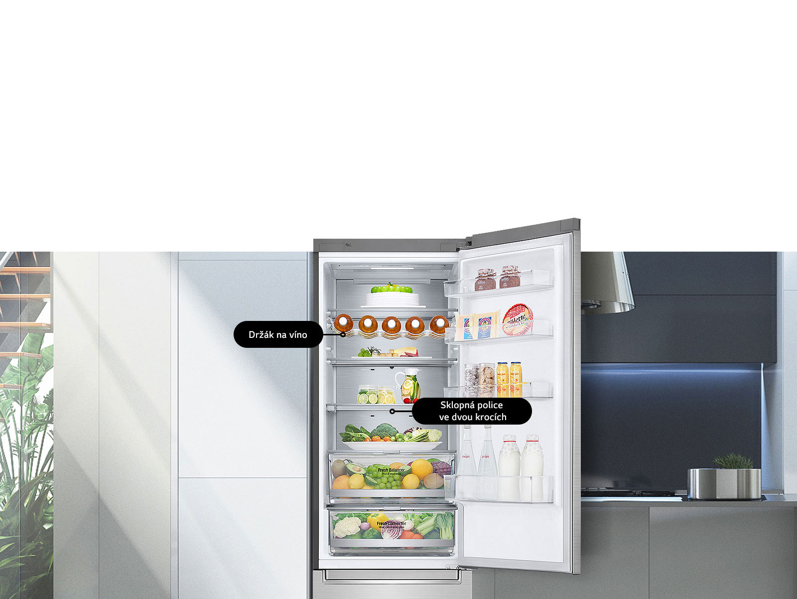 Držák na víno a sklopná police zjednodušují odkládaní potravin, zvyšují fexibilitu prostoru a zlepšují uspořádání v chladničce.