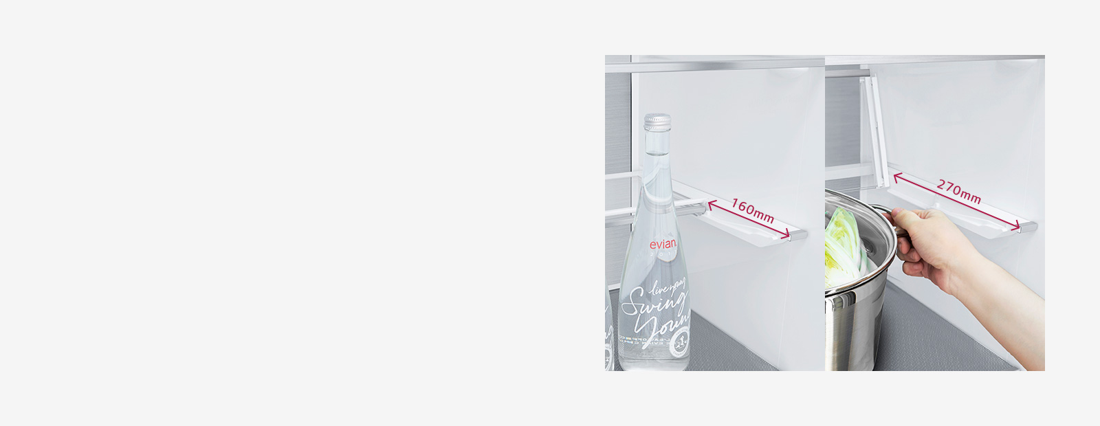 Police s možností složení ve dvou krocích zajistí dostatek místa pro potraviny libovolných rozměrů a vytváří prostor pro vysoké a objemné nádoby.