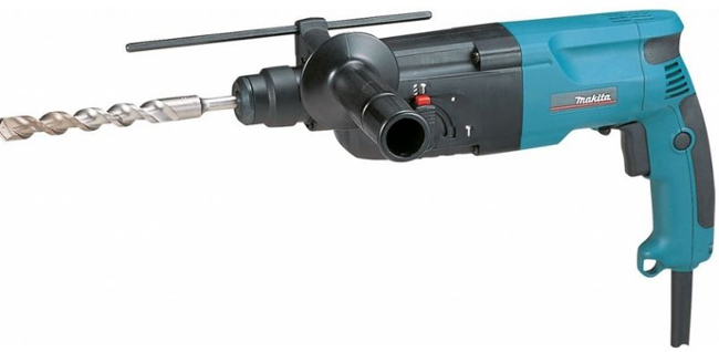 Kombinované kladivo značky Makita. Funkce vrtání a sekání. Upínání nástroje upraveno pro SDS-PLUS. Cik-cak povrstvení vinutí rotoru a přáškové povrstvení statoru ideálně chrání stroj proti prachu. Elektronický vypínač se spínačem pro stálý chod.