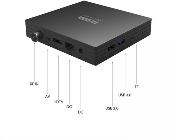 - Rozhraní: AV, DC 5V, HDMI, LAN, RJ45, karta TF, USB2.0, USB3.0, RF IN