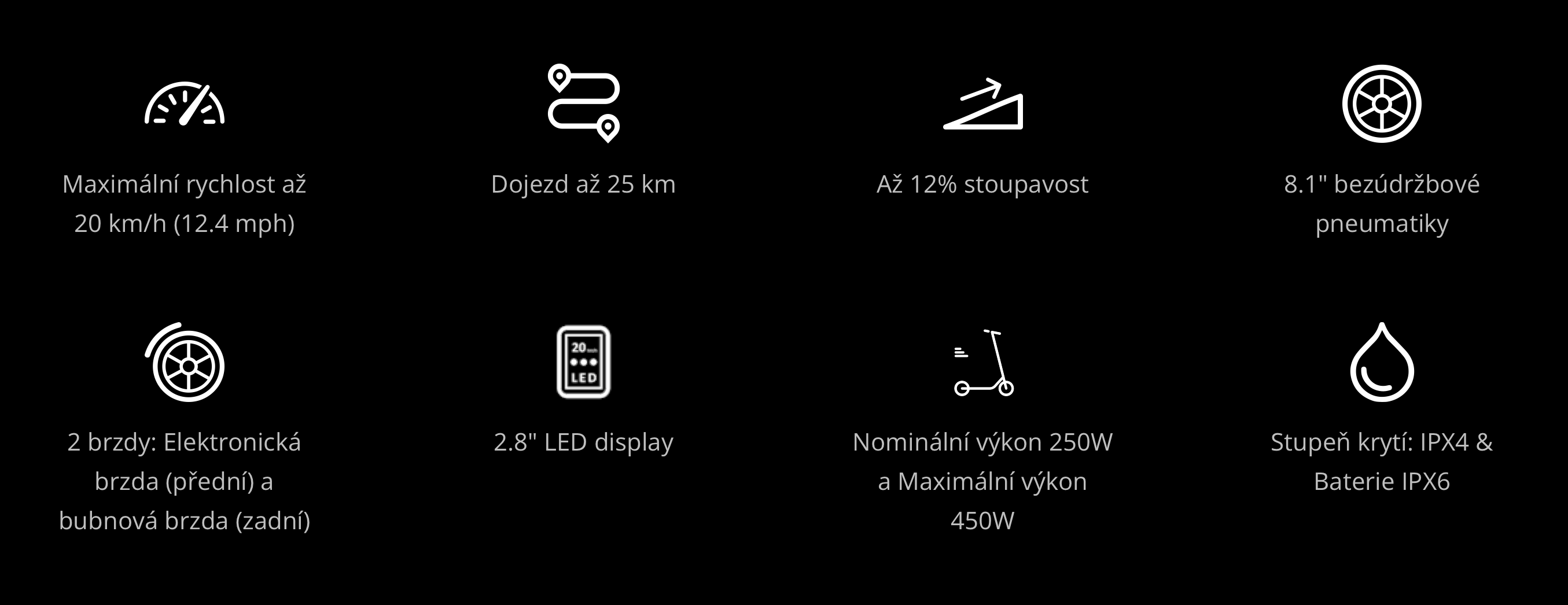 Výkon motoru 250W poskyuje dostatečný výkon pro zrychlení i 12% stoupání