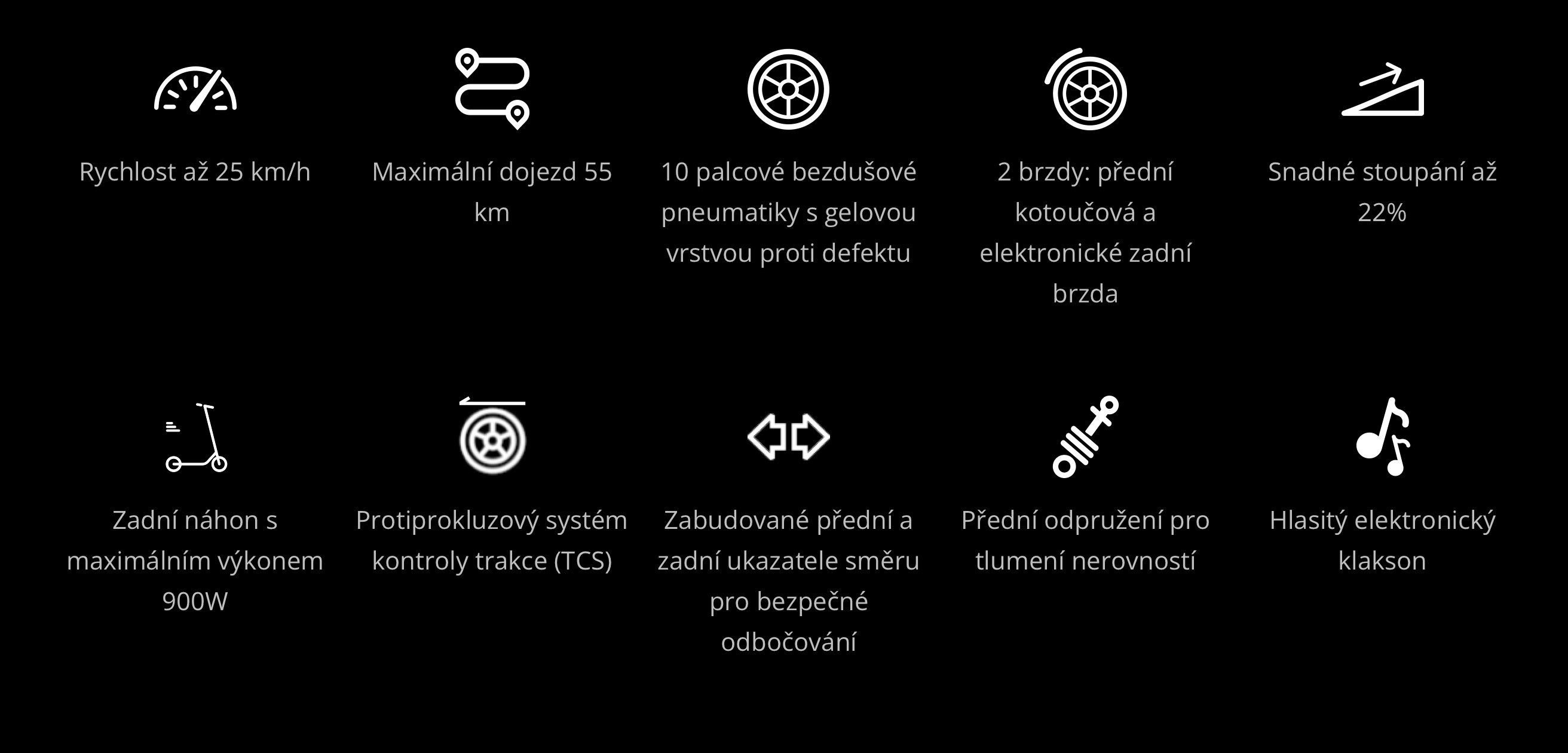 - Teoretický dojezd: Testováno při jízdě s plnou baterií, zatížením 75 kg, okolní teplotě 25 °C při průměrné rychlosti 16 km/h na vozovce.