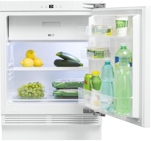 Vestavná jednodvéřová lednička, en. třída F, spotřeba 185 kWh/rok, objem chladničky 104 l, objem mrazničky 17 l, hlučnost 39 dB, bílá