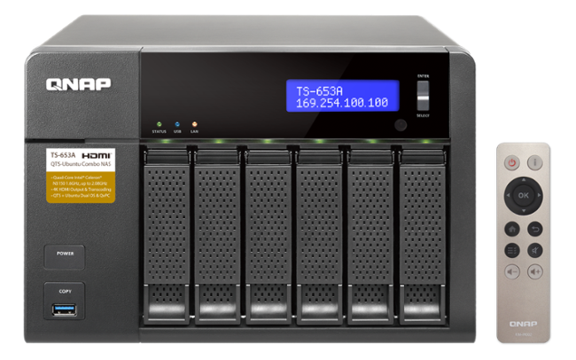 TS-653A je dodáván s dálkovým ovládáním QNAP kterým můžete pohodlně ovládat HD Station pomocí integrovaného infračerveného přijímače. S pomocí nové inteligentní funkce učení dálkového ovládání, můžete spárovat až tři TV nebo stereo IR dálkové ovládání a naprogramovat často používané tlačítka a funkce. Od teď, už nikdy nebudete žít ve strachu ze ztráty nebo poškození vašich jednotlivých dálkových ovládání. Dále máte možnost přeměnit svá mobilní zařízení na dálková ovládání instalací aplikace Qremote.