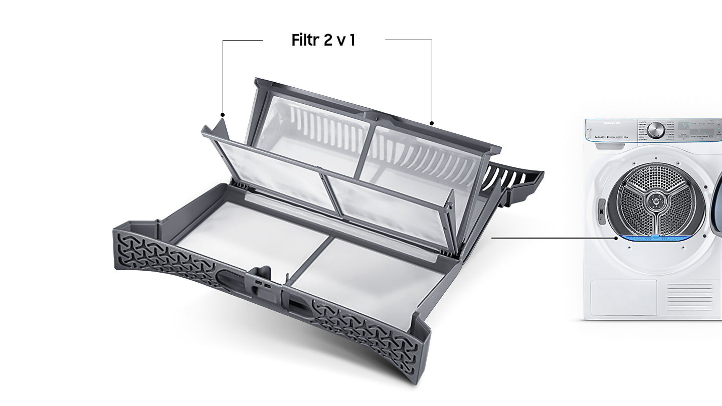 Optimalizujte sušicí výkon, bezpečnost i údržbu své sušičky. Vylepšený filtr 2 v 1 je tvořen dvouvrstvým síťovým filtračním řešením, takže není nutné použití filtru pro tepelný výměník. Dva alarmy vás pak upozorní ve chvíli, kdy je potřeba filtr nebo výměník vyčistit.