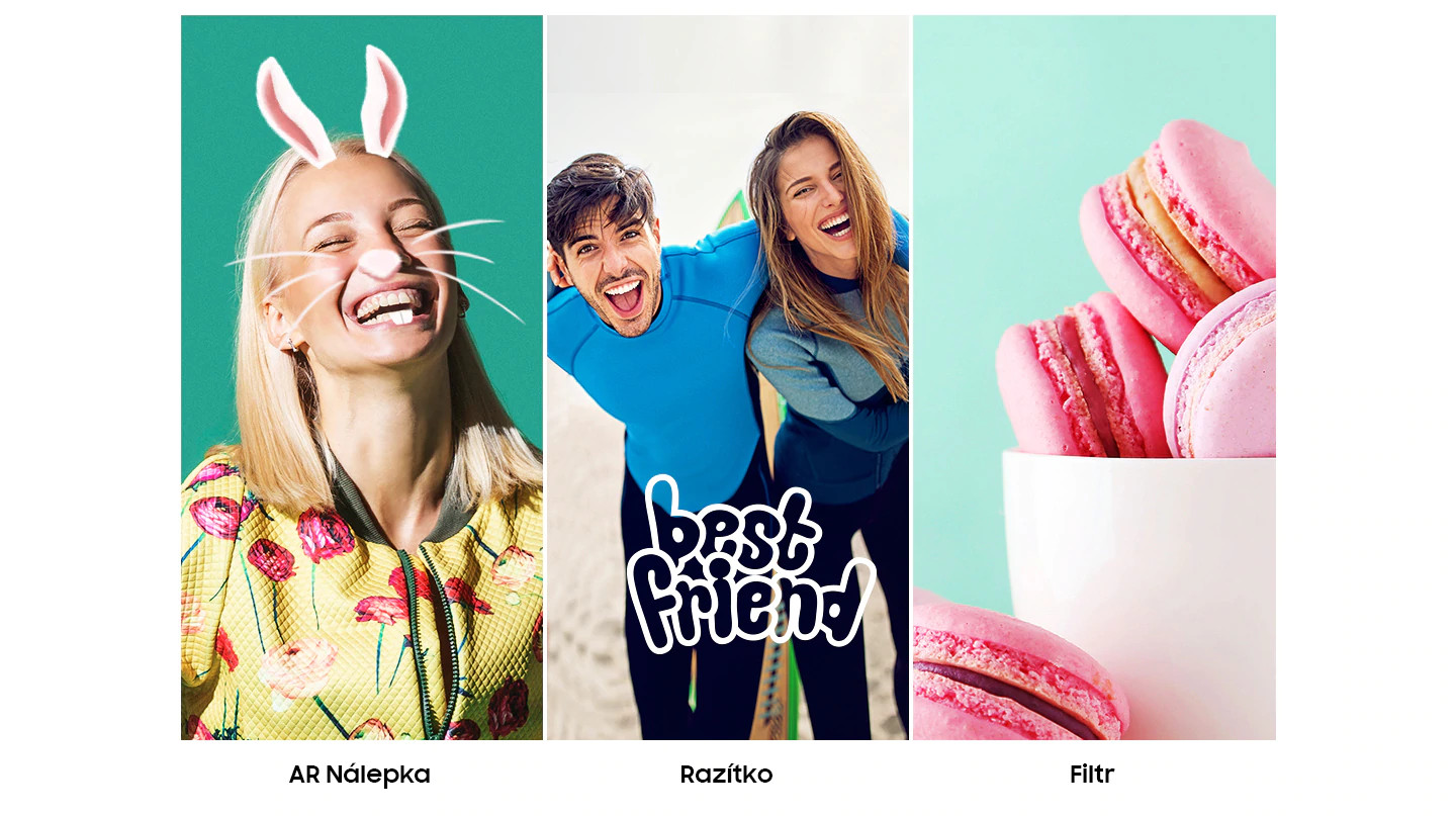 S Galaxy A10 nejsou fotky jen tak ledajakými fotkami. Ozdobte vaše vzpomínky AR nálepkami, razítky a filtry, které vás zabaví po zachycení skvělého snímku.