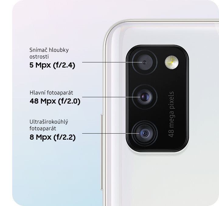 Pokročilým trojitým fotoaparátem Galaxy A41 vytvoříte ostřejší, dokonale ohromující snímky. Foťte křišťálově čisté záběry s hlavním 48Mpx objektivem po celý den. S 8Mpx ultraširokoúhlým objektivem do záběru dostanete více z toho, co vidíte, a 5Mpx Depth objektiv vám pomůže zaostřit na to, co je důležité.