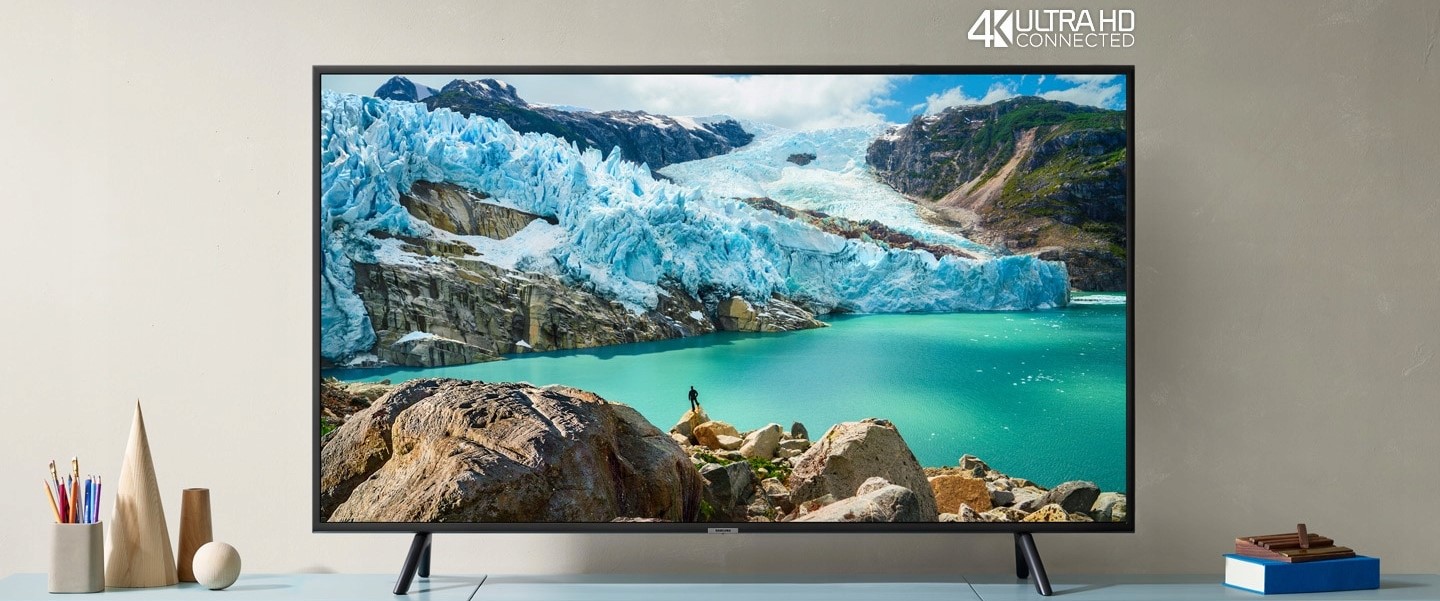 Moderní elegance UHD televizoru Samsung přirozeně zvýrazní vkusný design vašeho stylového interiéru.