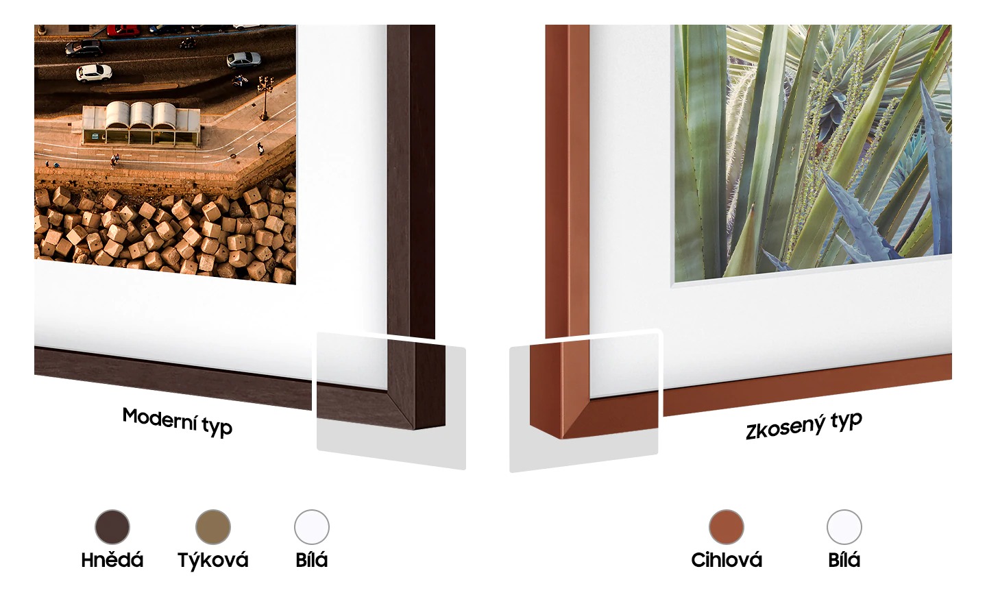 Moderní typ je kompatibilní s televizory The Frame 43"~ 75", zatímco Zkosený typ je kompatibilní s modely 65" a 55".