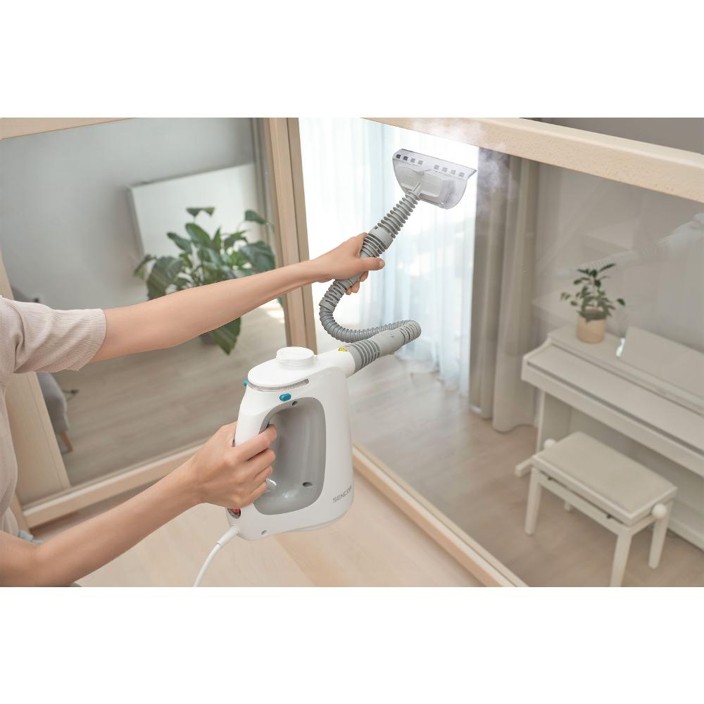 Dokonale průhledná okna i zrcadla bez šmouh, o to se postará praktická stěrka. Nástavec s textilním návlekem zase využijete pro parní dezinfekci čalounění, sedaček, matrací, závěsů nebo oděvů.