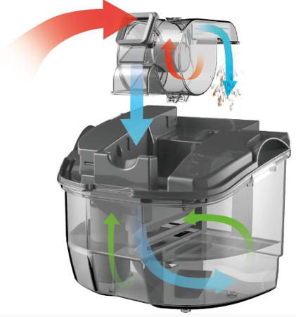 - Dual Filtration System kombinuje v jedné nádobě sílu cyklónu a vodní filtraci