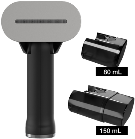 Napařovač oděvů SteamOne EUFD80B je vybaven speciálním háčkem pro snadné zavěšení oděvu i s ramínkem na dveře či skříň a dvěma vyměnitelnými nádržkami na vodu o objemu 80 ml a 150 ml.