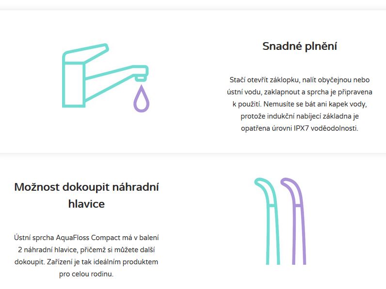 AquaFloss Compact se díky praktickým rozměrům vejde do každé tašky i kabelky. Oproti ostatním ústním sprchám není připojena ke stanici s nádržkou na vodu. Zásobník je umístěn přímo v rukojeti – přenášení je tak opravdu snadné. Zvláště lidé s onemocněním dásní nebo rovnátky ocení dodatečnou ochranu kdekoliv.