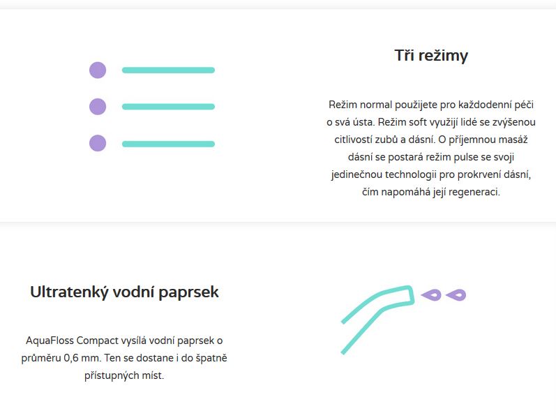 AquaFloss Compact má několik režimů, takže si ji plně přizpůsobíte – třeba nastavením úrovně tlaku. Do nádržky můžete kromě obyčejné vody nalít i ústní vodu pro extra porci svěžesti a hygieny. Ústní sprchy snižují v kombinaci s kartáčkem riziko vzniku kazu. Tím pádem vás ušetří nepříjemných návštěv stomatologa i nečekaných nákladů.