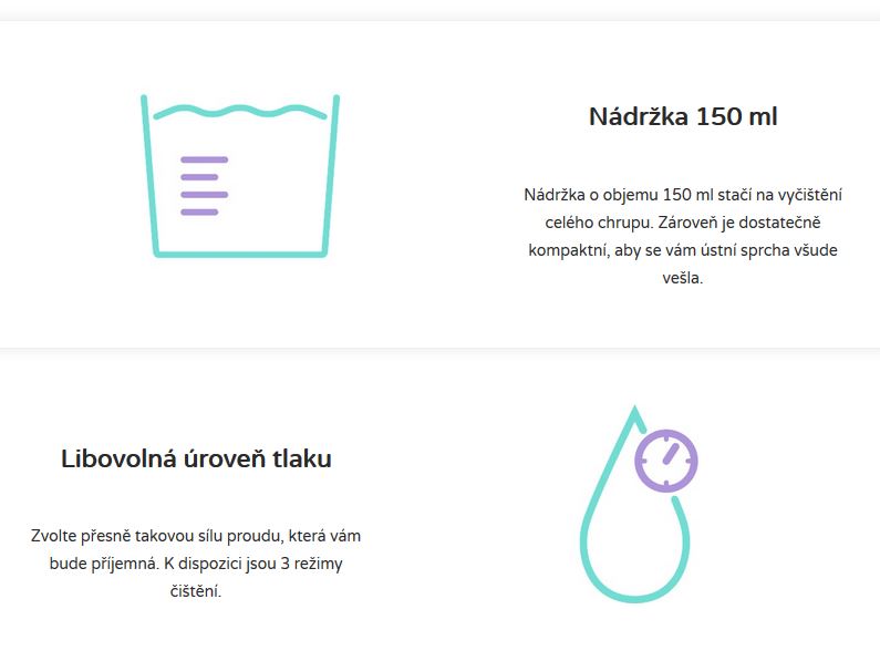 Ústní sprcha pro dokonalou zubní hygienu, prevence kazu a zánětu dásní, 3 módy nastavení pro odstraňování zubního plaku, 150ml nádržka na obyčejnou nebo ústní vodu, 2 trysky v balení, otočná hlavice, lehké a přenosné zařízení.