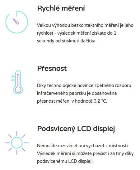 Využívá technologie infračerveného záření a dosahuje tak během okamžiku velmi přesných výsledků. Teploměr stačí přiblížit k předmětu a do jedné sekundy získáte výsledek měření.