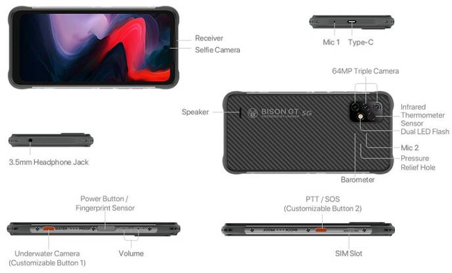 BISON GT2 5G má další užitečné funkce jako jsou: Bluetooth 5.2, Dvoupásmová GPS L1+L5, Multifunkční NFC, Podpora Google Pay, Infračervený teploměr 2.0, Duální mikrofony, Boční čtečka otisků prstů, Odemykání obličejem s umělou inteligencí, Globální pásma a dvě 5G SIM karty