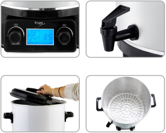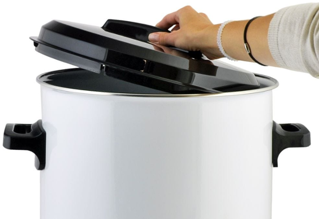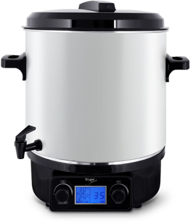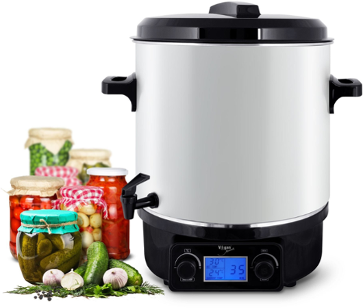 Univerzální zavařovací hrnec o objemu 27 l s digitálním ovládáním a příkonem 1800 W. Vigan Mammoth ZH27 DGX digital je perfektní pro zavařování ovoce, zeleniny, hub a masa nebo pro ohřívání a udržování teploty nápojů, gulášů či polévek. Vyniká pláštěm z bílého smaltu, nastavitelným termostatem a tepelně izolovanou rukojetí.