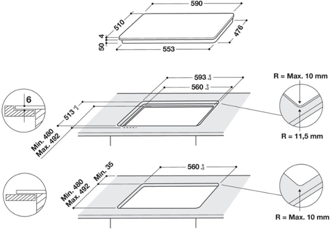 - Rozměry otvoru pro zabudování (vxšxh): 30-60x560-562x480 mm