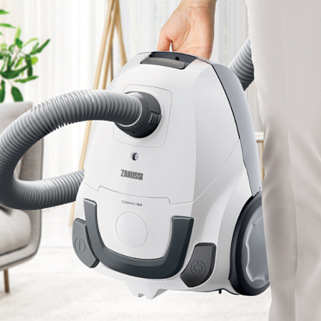 Sáčkový vysavač Zanussi s maximálním příkonem 700 W, akční rádius až 7,5 m, délka kabelu 4,5 m, praktická rukojeť, hubice DustPro, indikátor plnosti sáčku, omyvatelný výstupní filtr, plastové trubky, měkčená kolečka, omyvatelný výstupní filtr.